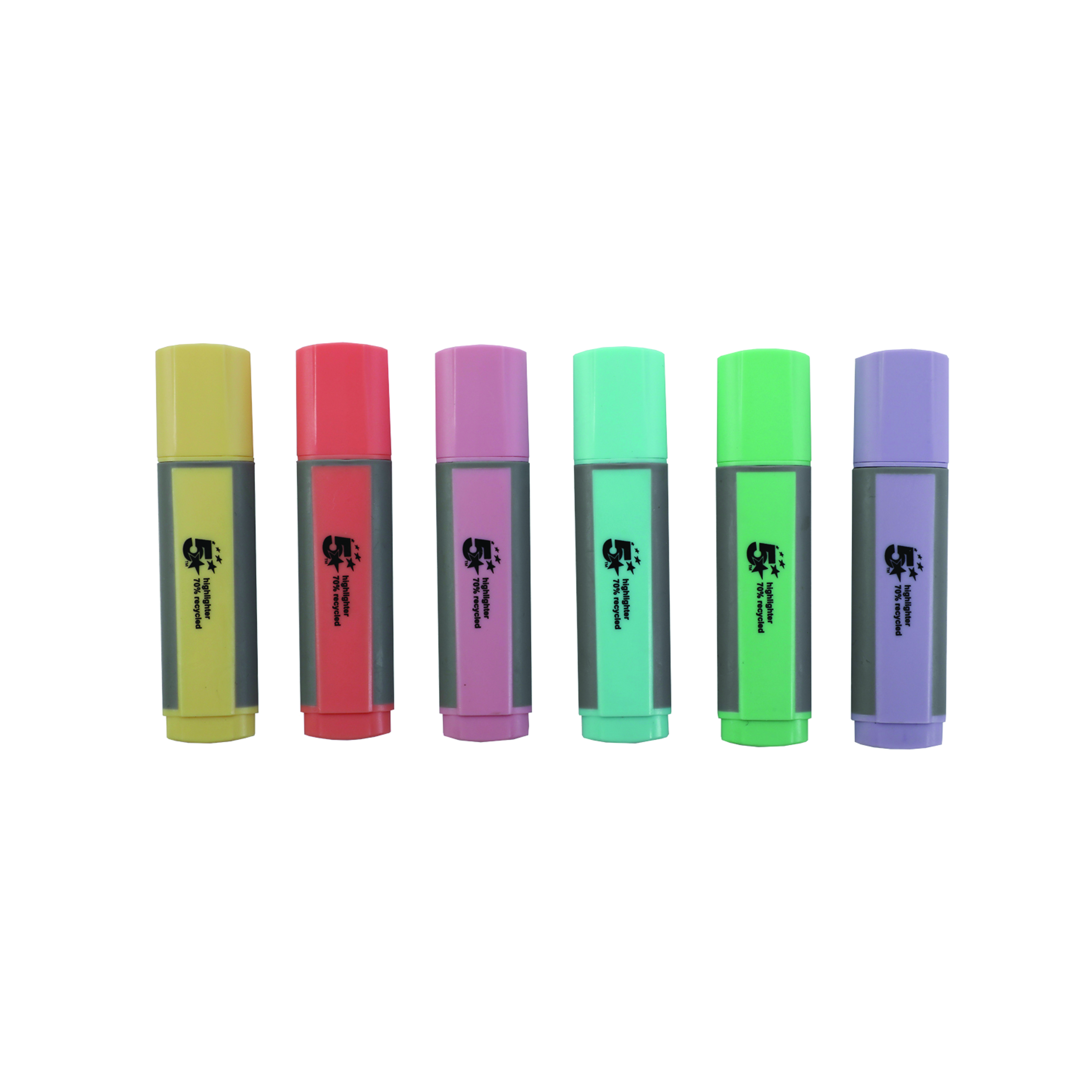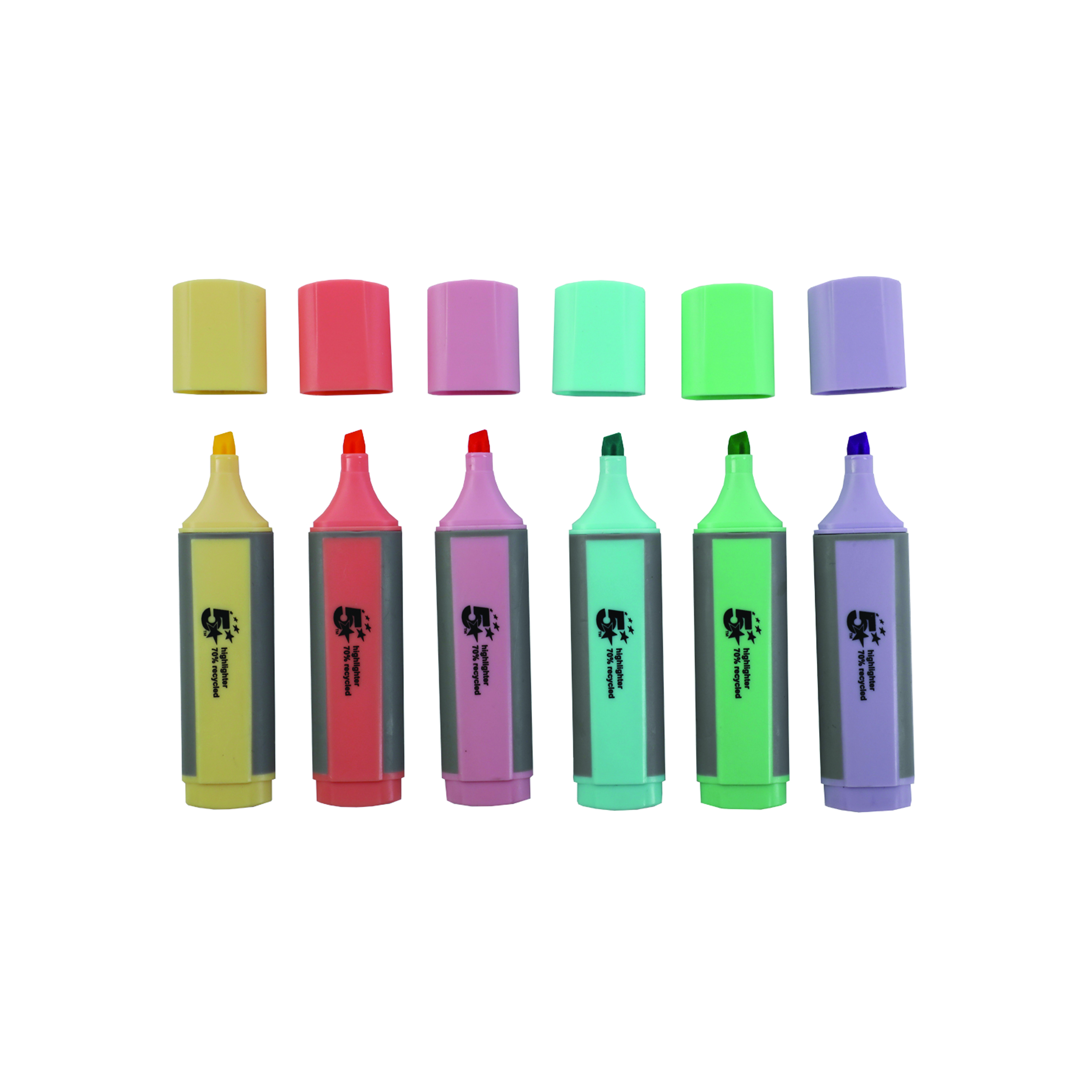 This pack of ten highlighters in pastel assorted colours feature chisel tips which are perfect for broad highlighting or fine underlining, making them ideal for school and office use. With sustainability in mind, the non-toxic ink formula is suitable for use in the classroom, and the plastic casing is made from recycled materials. Including pastel colours: 2 yellow, 2 pink, 2 green, 2 blue, 1 orange and 1 purple, these mild pastel highlighters will create softer highlighting marks to art and schoolwork.
